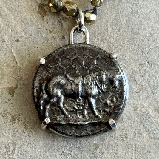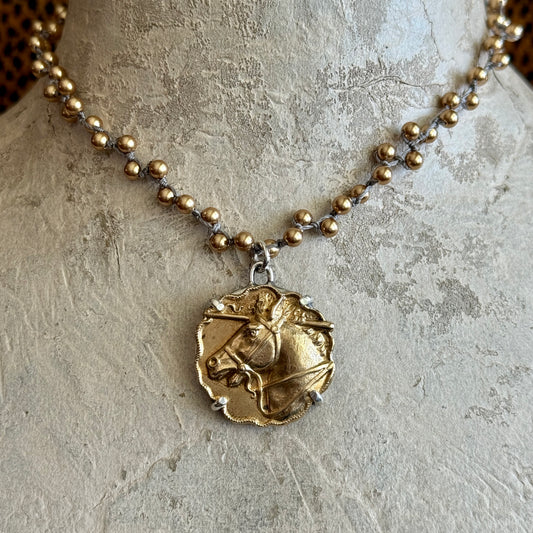 Vintage Yellow Hunter Horse Bridle Rosette on Pearl Crystal Necklace