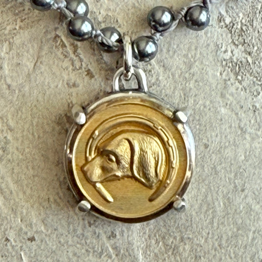 Handsome Silver Hound in Horseshoe Dog Button Necklace