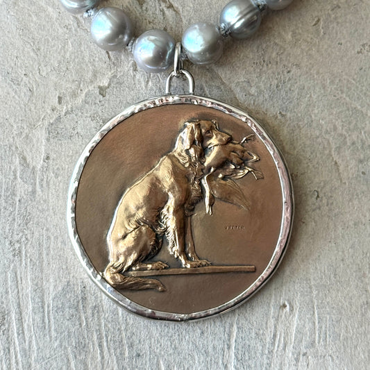 Bronze Retriever Dog Medal on Pearl Necklace