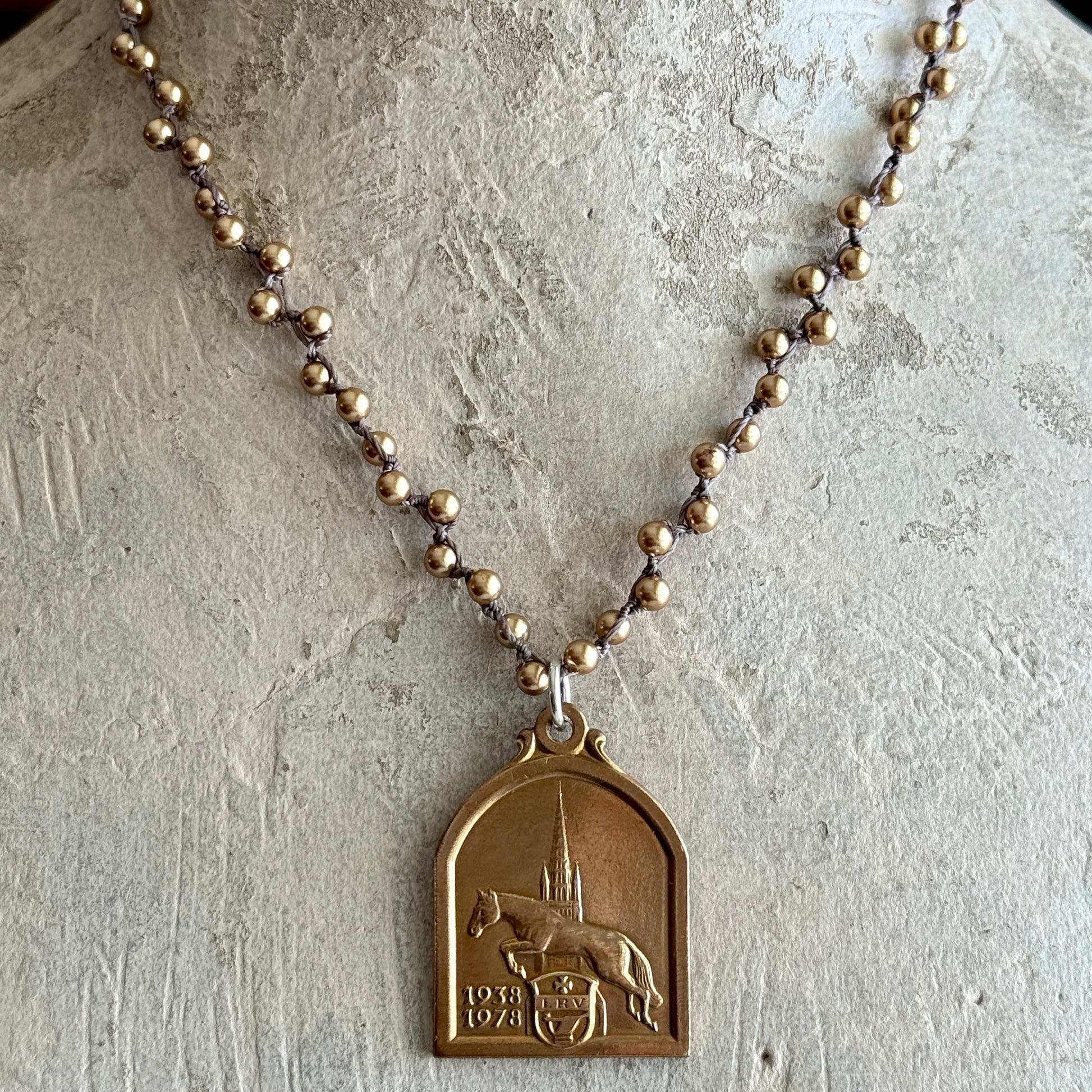 This lovely 1 1/2" high bronze medal from Belgium features a horse jumping with a steeple in the background. The medal is suspended from a 17" necklace of offset knotted gold Swarovski Pearls. This easy to wear necklace is sure to become a favorite!