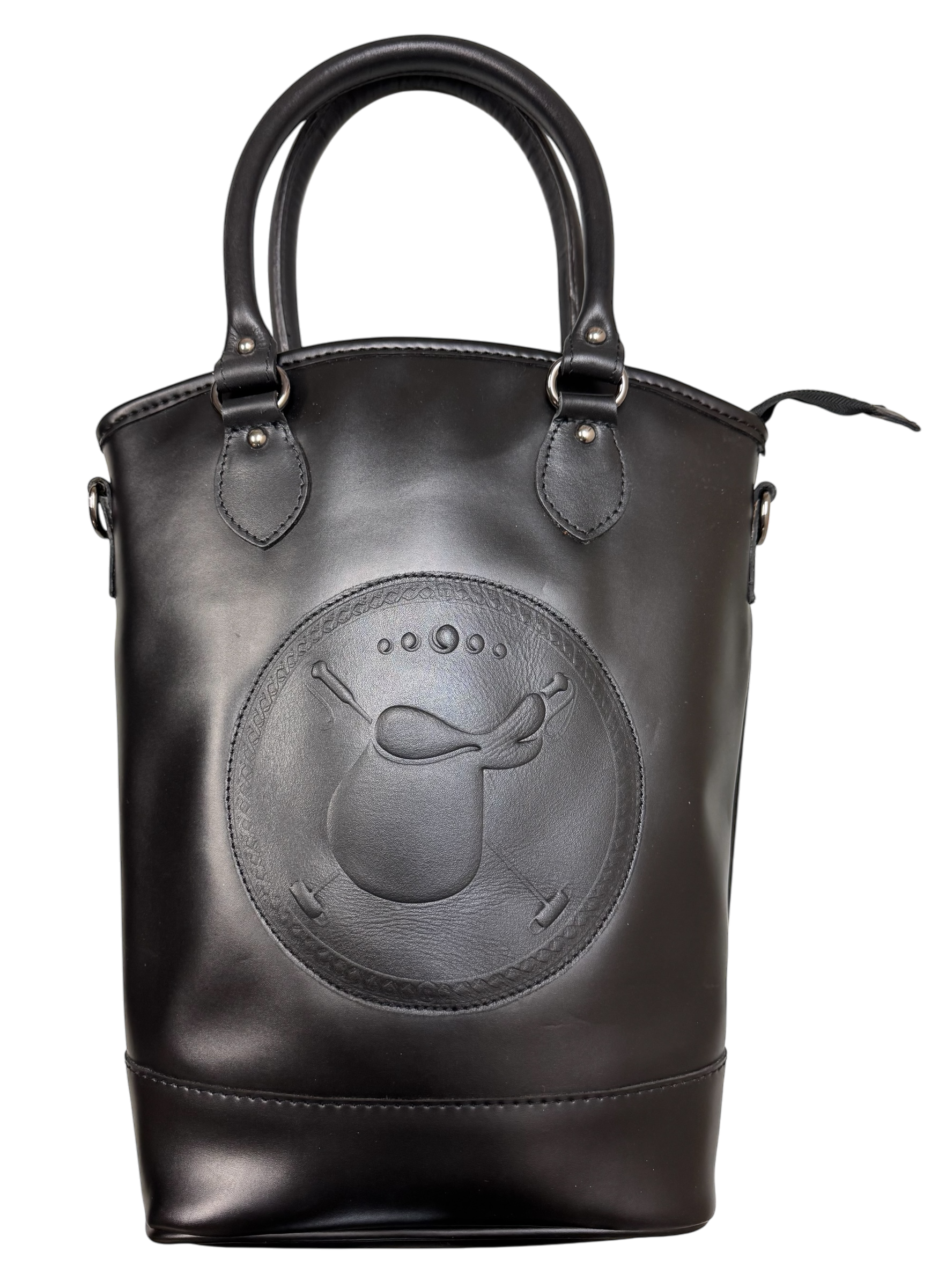 Introducing the Après-Show Cooler...the fun and functional tote for keeping your drinks and assorted items cold. Holds 2 bottles in a removable bottle insert, includes an optional shoulder strap and exterior pocket. Synthetic leather base, leather accents.