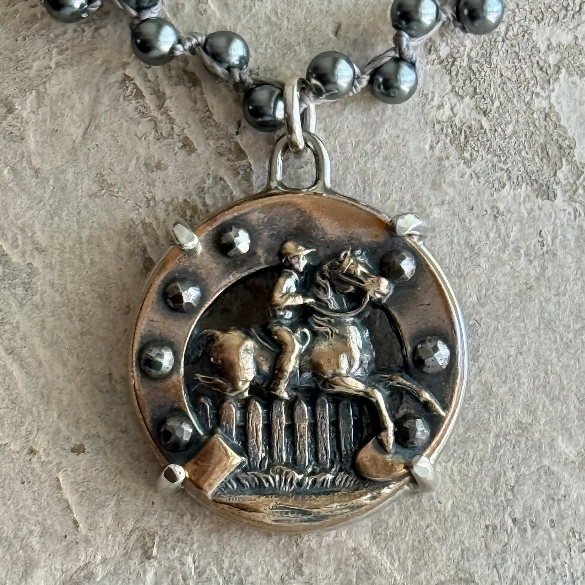 This one-of-a-kind button is special! Antique buttons such as this lovely jumping horse design once graced the front of riding, hunting and hacking jackets. Measuring approximately 1" in diameter, this one-of-a-kind button is prong set in sterling silver and transformed into a pendant then suspended from a lovely 18" necklace of offset knotted cord punctuated with Swarovski pearls. These beauties are made to last!