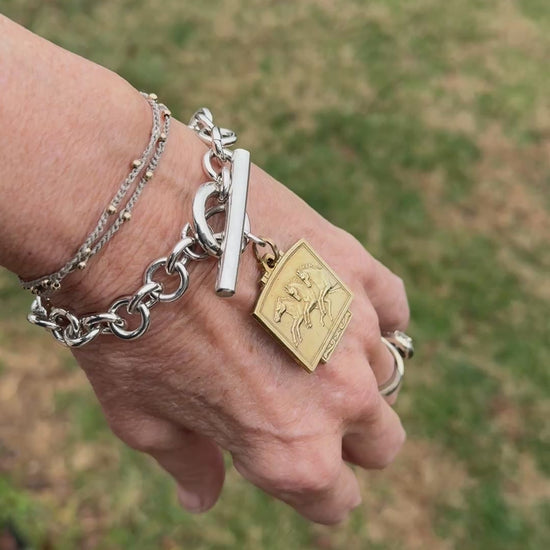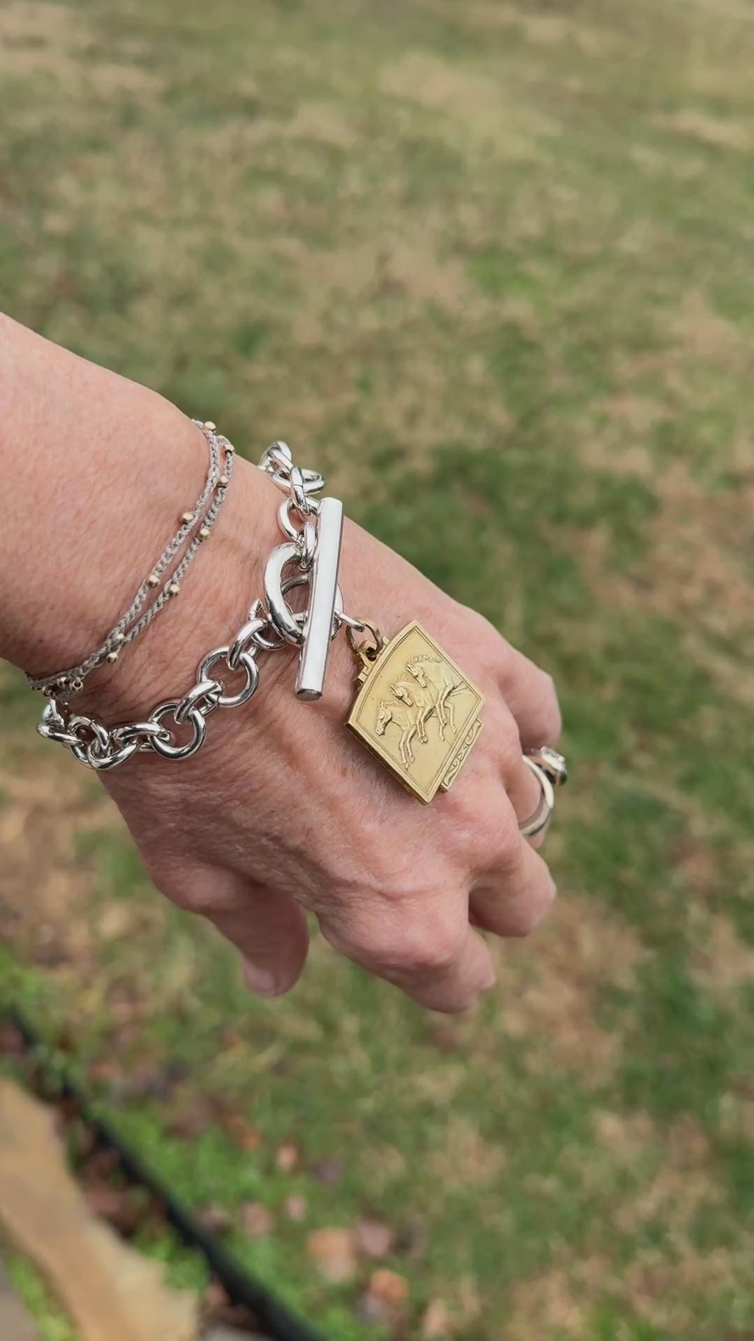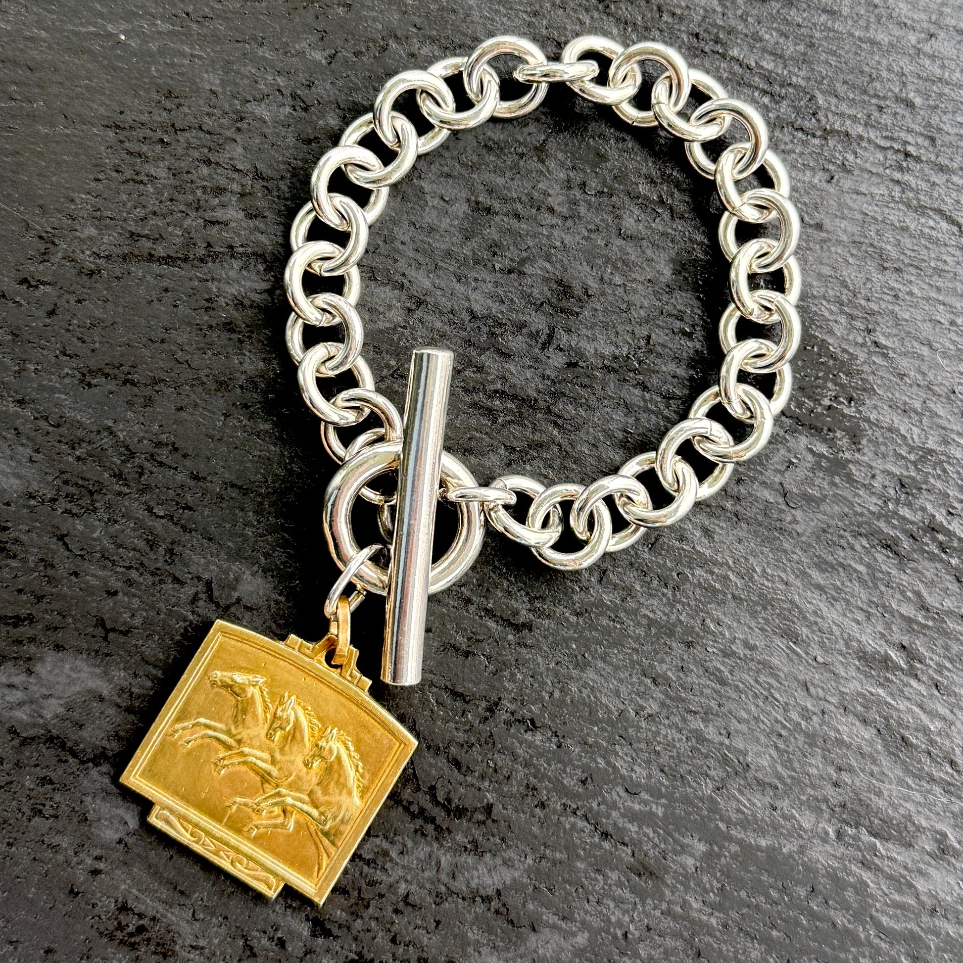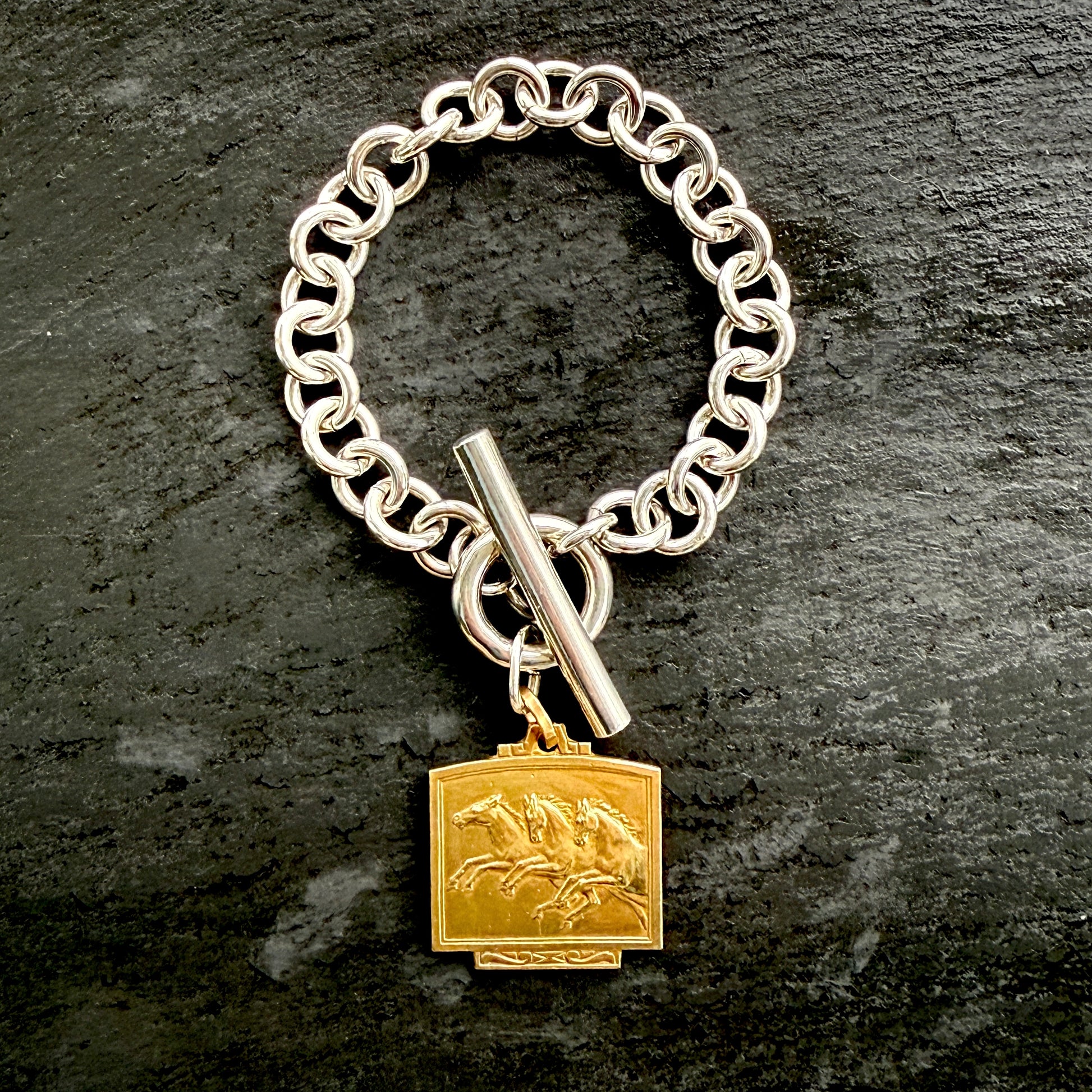 Statement piece alert! This classic and elegant solid sterling silver bracelet is bound to get noticed. This bracelet features a chunky heavy sterling silver chain with a toggle closure. Suspended from the ring of the toggle is a solid bronze medal featuring three jumping horses.The wearable length of this bracelet is 8". Alterations are available at no additional charge. One-of-a-kind.
