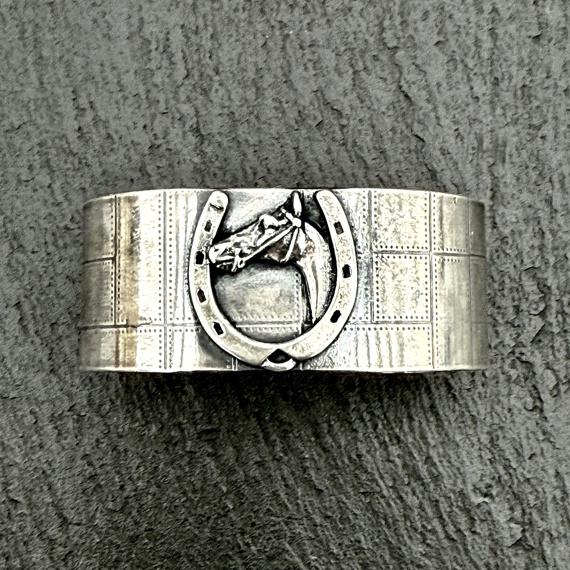 This exceptional sterling silver cuff bracelet merges equestrian symbolism with refined craftsmanship. The six-inch base showcases an intricate riveted metal pattern, crowned by a refined horseshoe enclosing a detailed horse head—a striking focal point that captures both tradition and elegance. The one inch adjustable gap ensures a personalized fit for any wrist. A statement piece that resonates with those who appreciate the artistry of horsemanship and timeless design. One-of-a-kind.