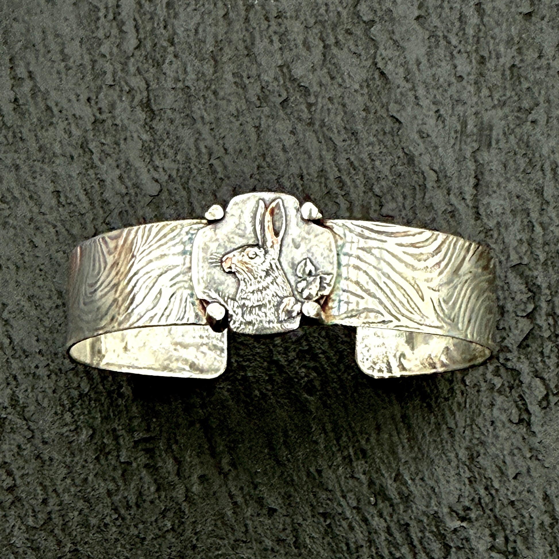 Crafted from sterling silver, this distinctive cuff bracelet showcases an exquisite bunny button as its focal point. The six-inch base features a swirl pattern, with a vintage-inspired button prong-set in precious metal for timeless appeal. The half-inch width provides comfortable wear, while the adjustable one-inch gap ensures a custom fit. Perfect for collectors of vintage treasures and those who appreciate artisanal craftsmanship, this one-of-a-kind piece combines nostalgic charm with refined design.