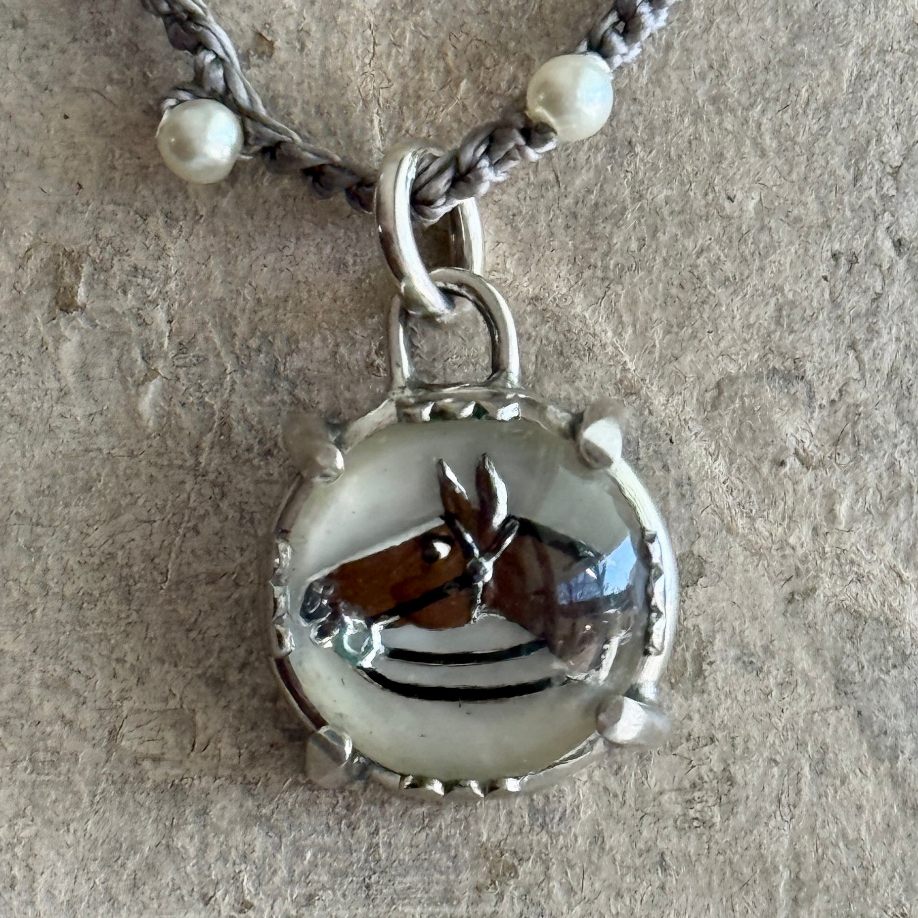 Little or Diminutive antique buttons such as this once graced the sleeves of a hacking jacket or waistcoat. Measuring approximately 1/2" in diameter, each one-of-a-kind button is prong set in sterling silver and transformed into a pendant then suspended from a lovely 18" necklace of crocheted cord punctuated with Swarovski pearls. These little beauties are made to last!