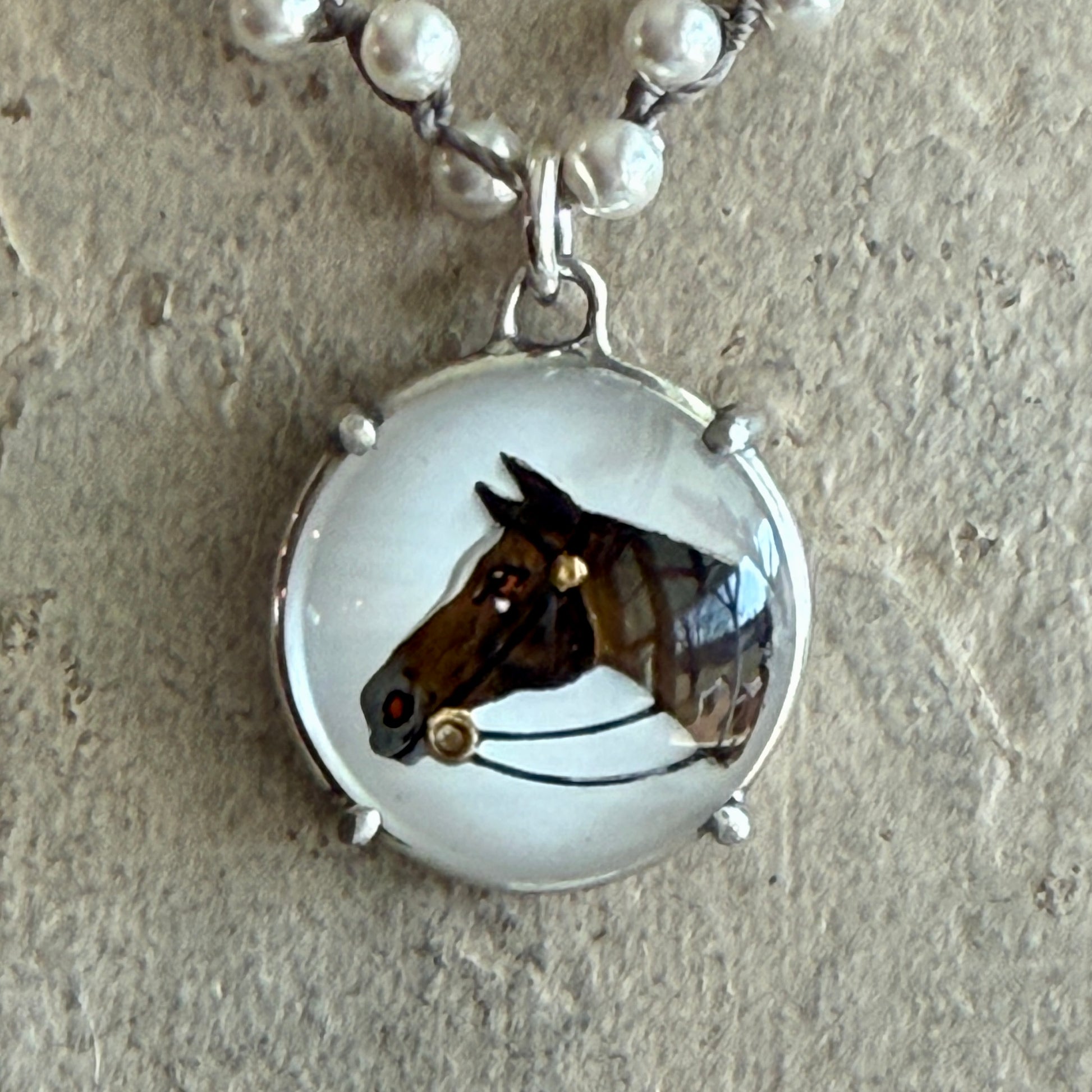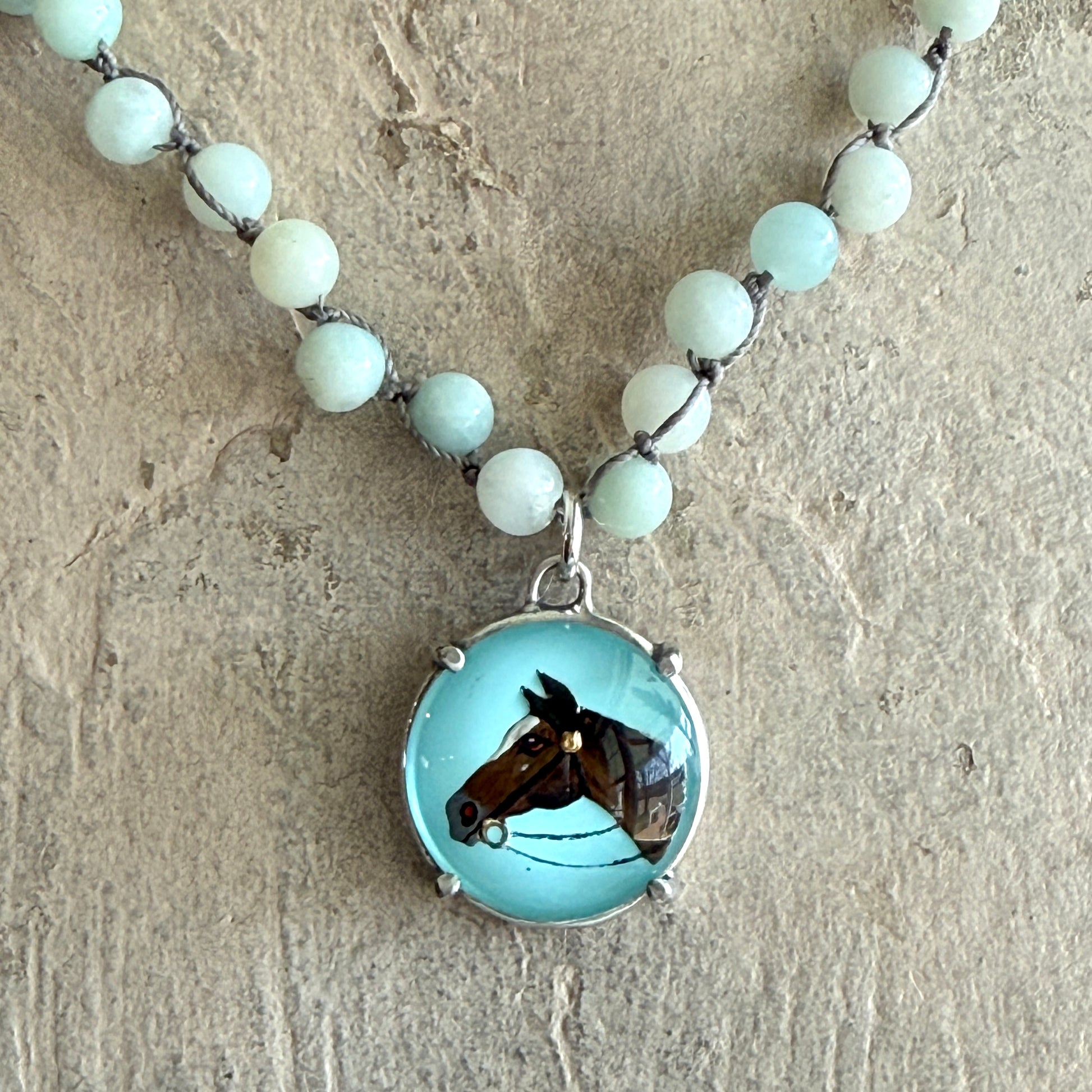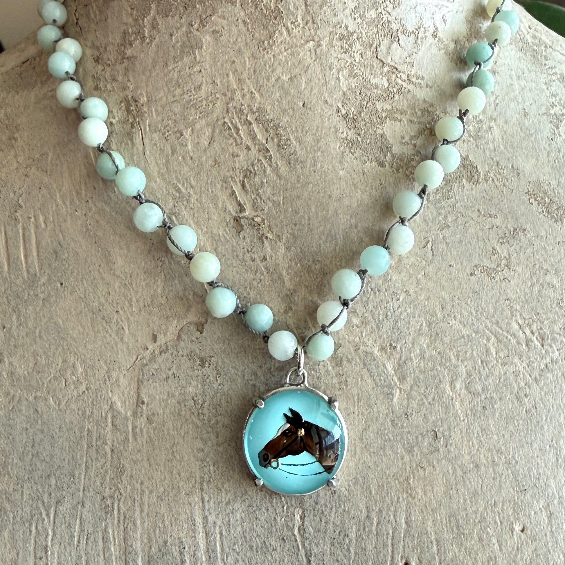 This gorgeous necklace features a medium crystal intaglio horse head design with wonderful detail in the painting. The 7/8" inch diameter piece has been prong set in sterling silver and suspended from a 17" necklace of hand-knotted Amazonite beads or white Swarovski pearls.