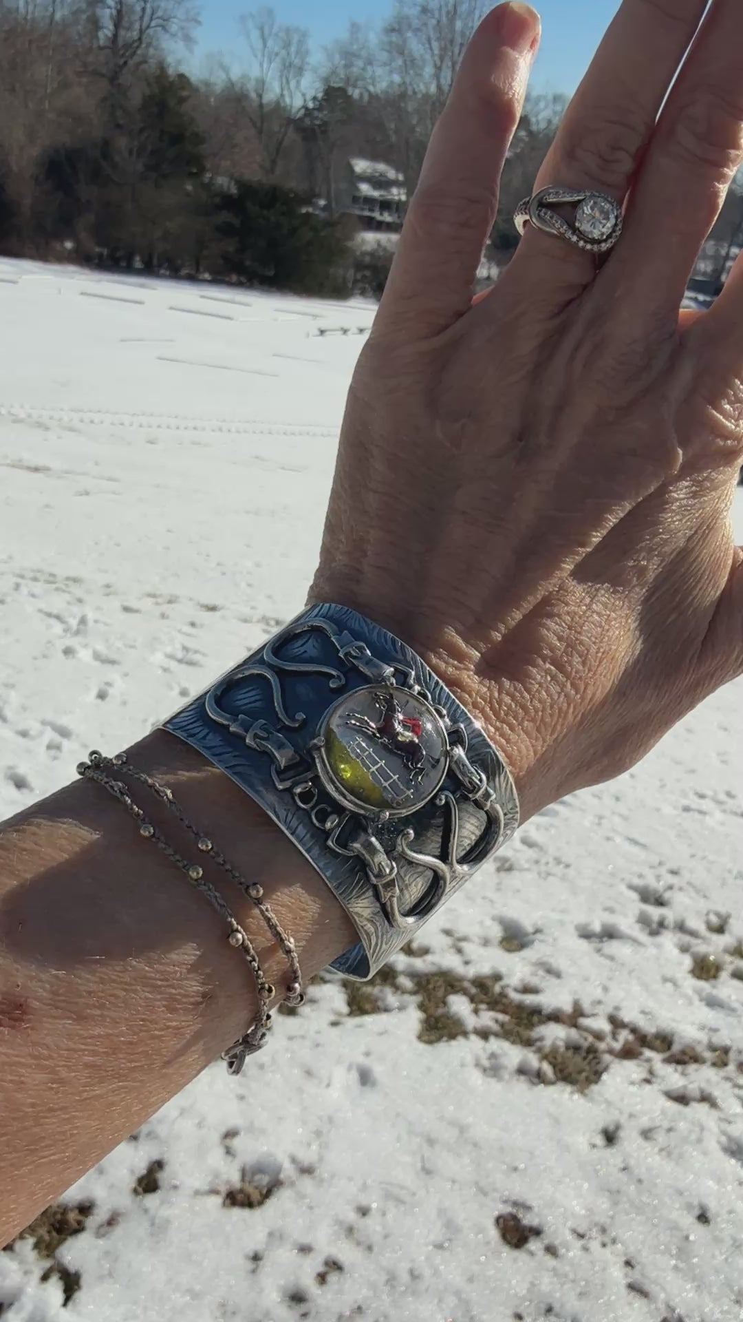 Statement piece alert! This gorgeous sterling silver cuff is just stunning. The cuff is embellished with a vintage sterling intaglio featuring a horse and rider clearing a large gate. The border of this brooch features elaborately curled leather strap details underlaying the intaglio. The background design on the cuff is a muted moire pattern. You'll love the distinctive look of this lovely piece. Measuring 1 1/2" wide by 6" long, with a 1" adjustable gap. For a better idea on fit, please see the attached video. My wrist measures 6" in diameter and I typically like a loose fit in bracelets. This cuff will easily fit a 7+ inch wrist.
