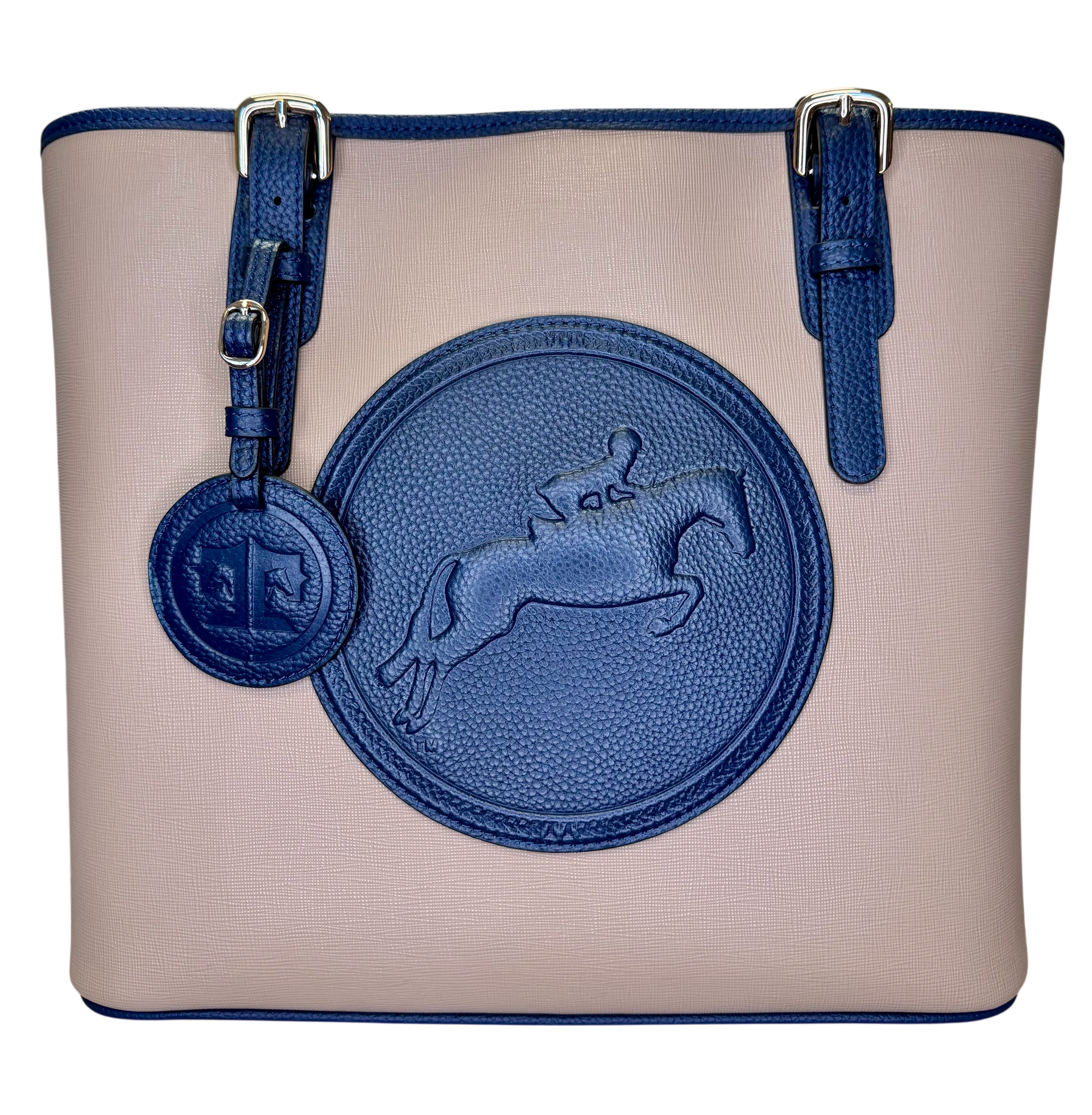 The James River Carry All ~ our most versatile and durable creation yet. This generous tote that does “carry all” is named in tribute to Jill’s father, who attended every show and the start of every hunt. Featuring scratch-resistant saffiano leather exterior, this handbag stands firm on carrying daily essentials for busy barn days, travel, or the mobile office. The roomy scarlet interior contains pockets for smart phone, key fob, large zip pocket and tablet compartment with embossed leather logo. Completed with silver hardware and feet, embossed with the discipline of your choice in pebble-grain leather in contrasting color.