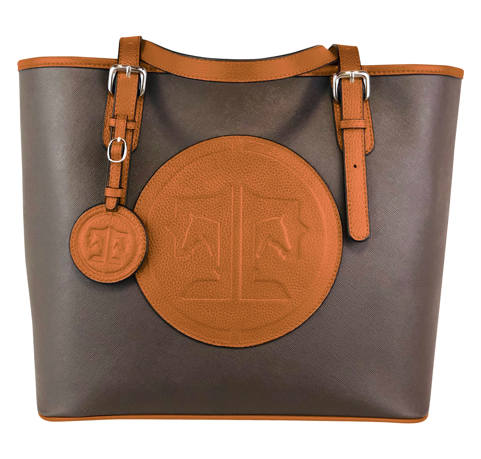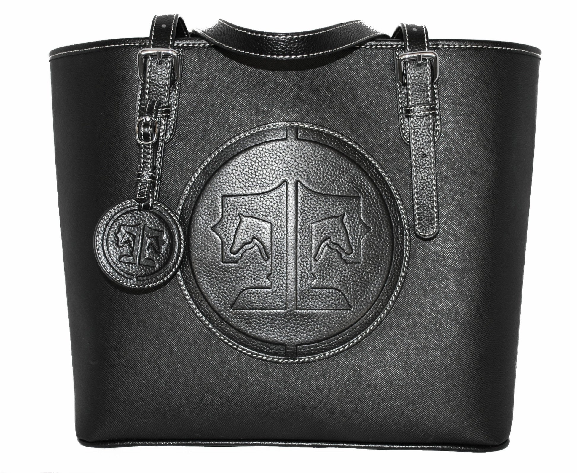 The James River Carry All ~ our most versatile and durable creation yet. This generous tote that does “carry all” is named in tribute to Jill’s father, who attended every show and the start of every hunt. Featuring scratch-resistant saffiano leather exterior, this handbag stands firm on carrying daily essentials for busy barn days, travel, or the mobile office. The roomy scarlet interior contains pockets for smart phone, key fob, large zip pocket and tablet compartment with embossed leather logo. Completed with silver hardware and feet, embossed with the discipline of your choice in pebble-grain leather in contrasting color.