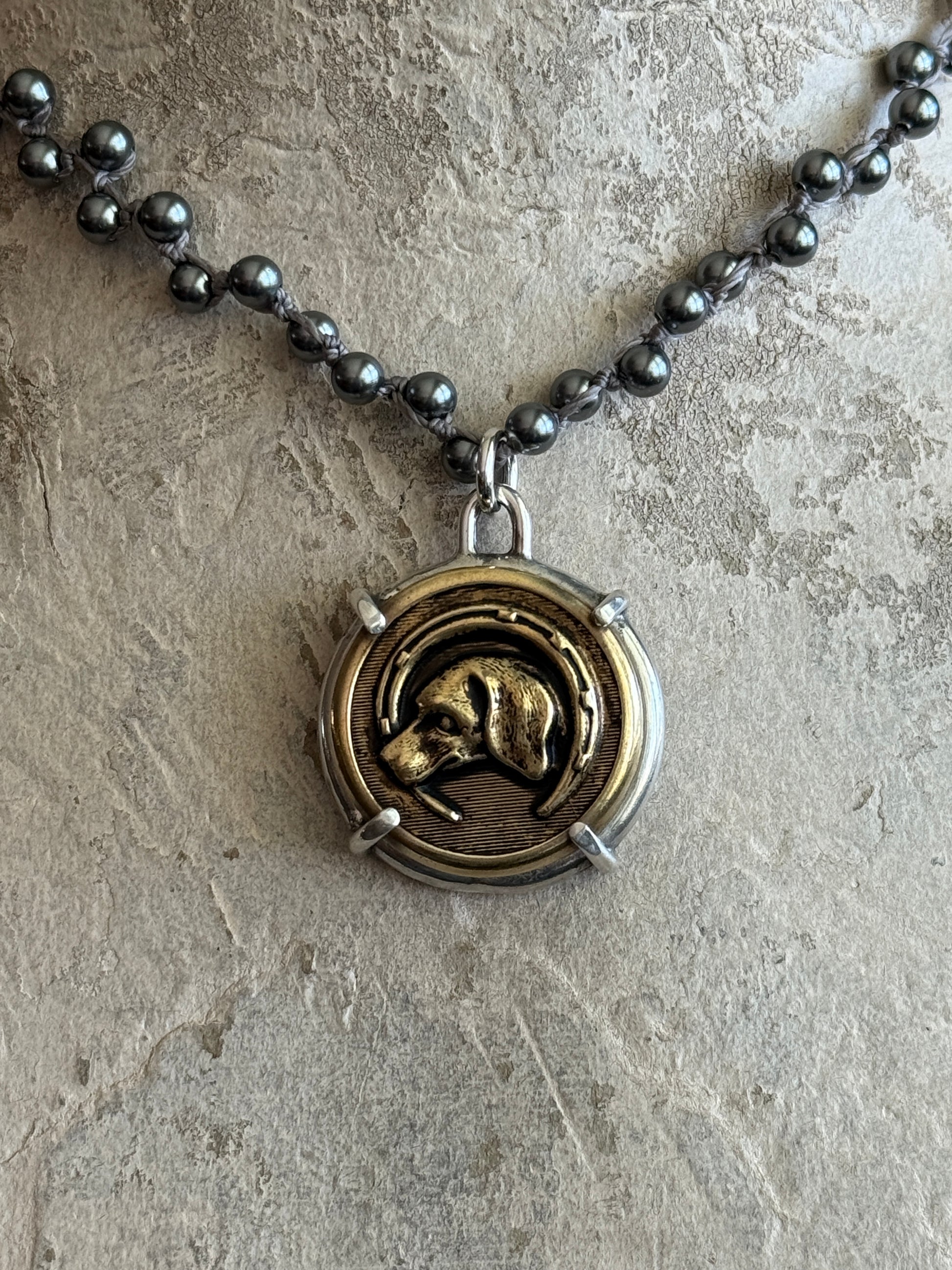 Antique buttons such as this once graced the front of a hacking jacket or hunt coat. Measuring approximately 1" in diameter, each one-of-a-kind button is prong set in sterling silver and transformed into a pendant then suspended from a lovely 17-18" necklace of knotted cord punctuated with Swarovski pearls. These little beauties are made to last!