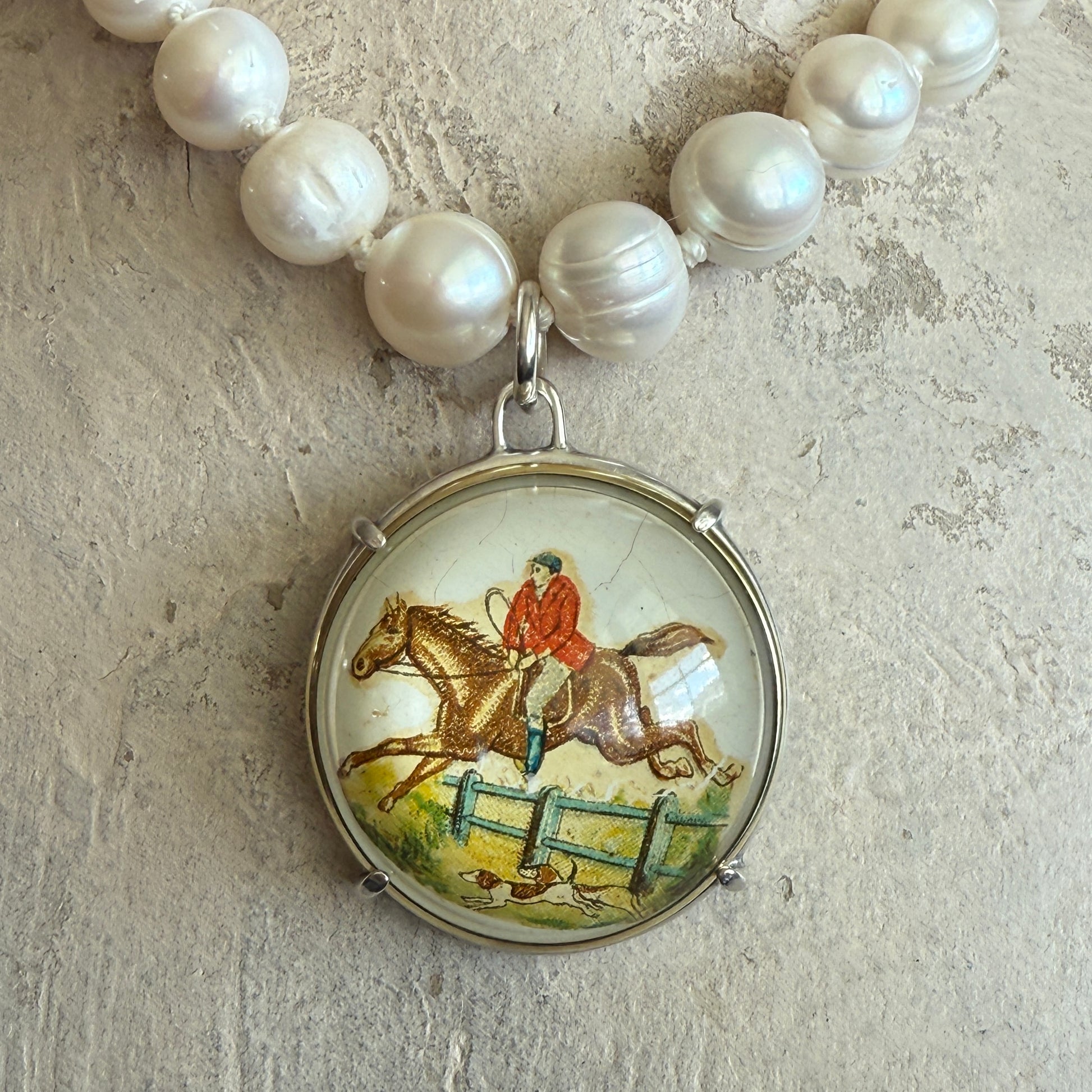 Bridle rosettes were used during the victorian period to adorn the bridles of carriage horses. Rosettes were designed to slide onto the bridle's headstall where the brow band attaches. Pristine examples such as the one featured in this necklace are becoming increasingly rare. The rosette measures 1 3/4" in diameter and is mounted on a complementary sterling silver bezel. The pendant is suspended from an 18 - 19" necklace of large hand knotted white freshwater pearls. These pearls have a beautiful luster, and are unique in that there is some variation in size and shape which only adds to the artisan quality of this gorgeous necklace. One of a kind.