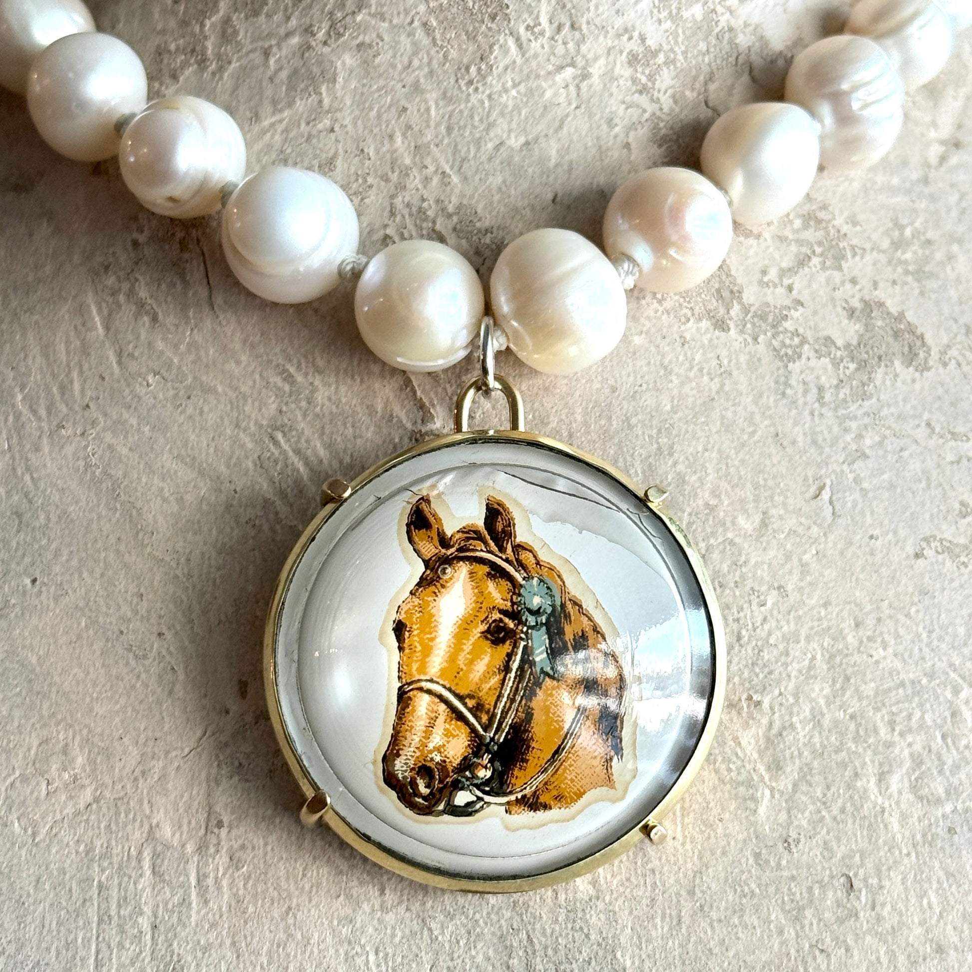 Vintage Horse Head Bridle Rosette on Pearl Necklace