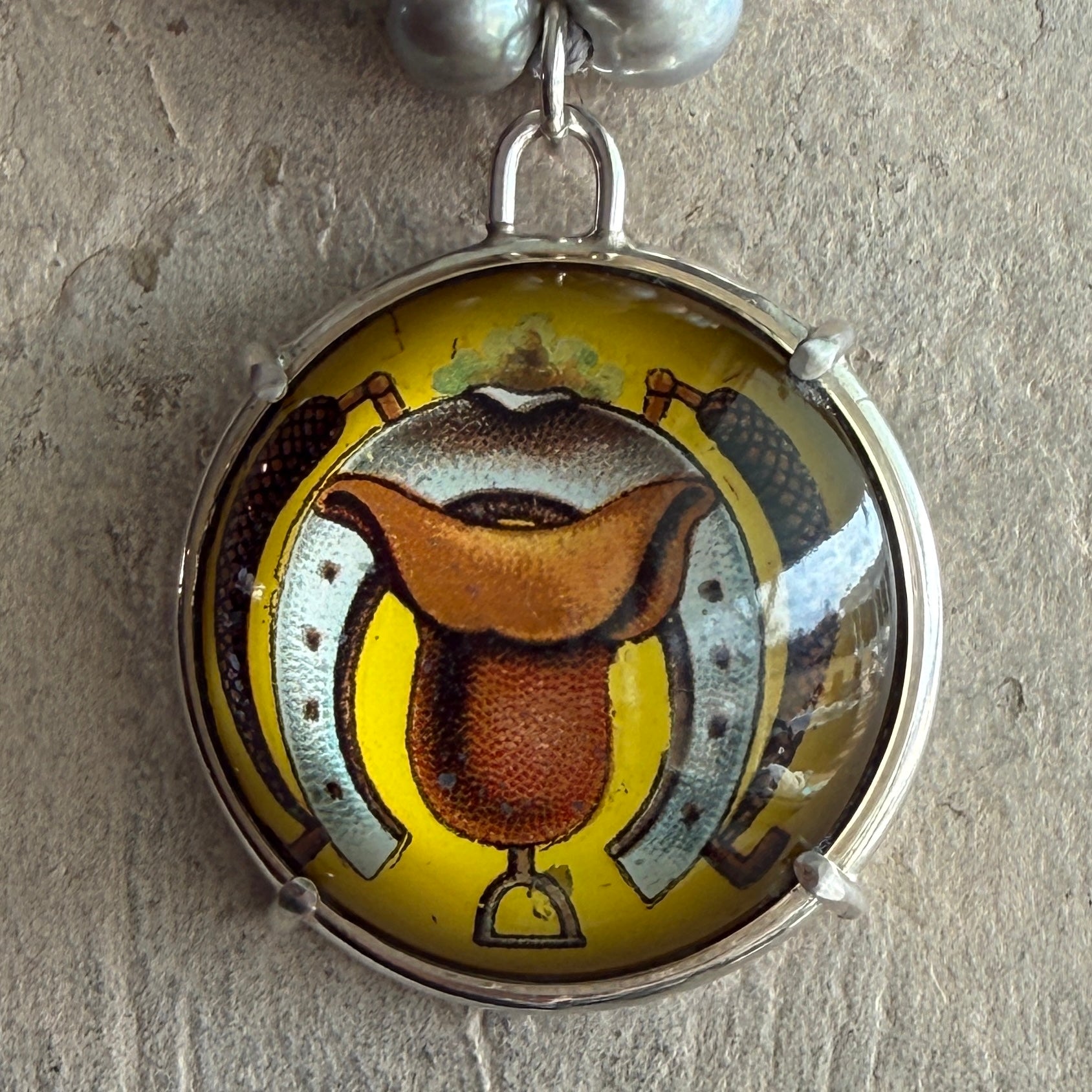 Vintage Yellow Horse Bridle Rosette on Pearl Necklace